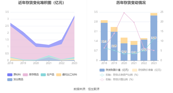 从存货变动来看,截至2023年年末,公司存货账面价值为3.26亿元,占净资产的11.05%,较上年末增加1.74亿元。其中,存货跌价准备为1802.36万元,计提比例为5.23%。