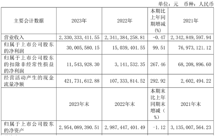 2023年,公司经营活动现金流净额为4.22亿元,同比增长292.92%;筹资活动现金流净额9992.05万元,同比增加4.62亿元;投资活动现金流净额-1.32亿元,上年同期为1.27亿元。