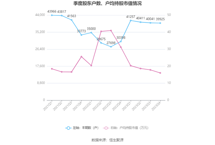 筹码集中度方面,截至2023年年末,公司股东总户数为3.99万户,较三季度末下降了116户,降幅0.29%;户均持股市值由三季度末的17.87万元下降至16.07万元,降幅为10.07%。