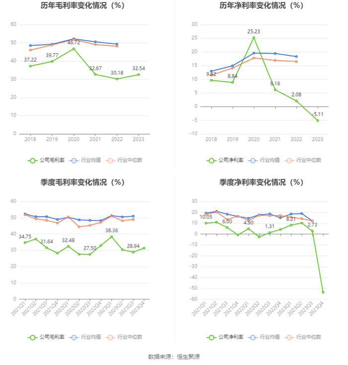 2023年,公司毛利率为32.54%,同比上升2.36个百分点;净利率为-5.11%,较上年同期下降7.19个百分点。从单季度指标来看,2023年第四季度公司毛利率为31.34%,同比下降1.57个百分点,环比上升2.40个百分点;净利率为-53.57%,较上年同期下降57.79个百分点,较上一季度下降56.30个百分点。