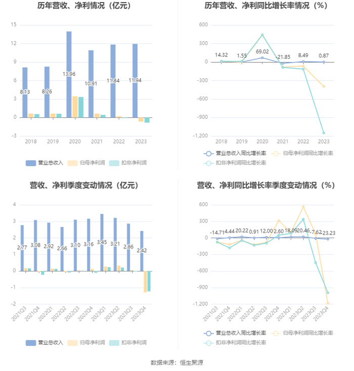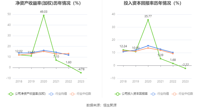 数据显示,2023年公司加权平均净资产收益率为-4.78%,较上年同期下降6.38个百分点;公司2023年投入资本回报率为-2.22%,较上年同期下降3.90个百分点。