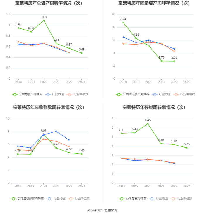 营运能力方面,2023年,公司公司总资产周转率为0.48次,上年同期为0.57次(2022年行业平均值为0.49次,公司位居同行业14/42);公司应收账款周转率、存货周转率分别为4.49次、3.83次。