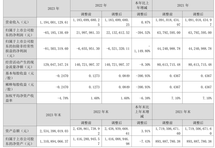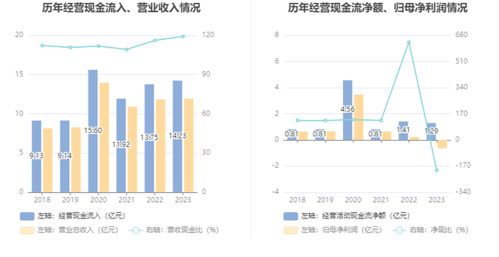 2023年,公司经营活动现金流净额为1.29亿元,同比下降8.30%;筹资活动现金流净额1.18亿元,同比减少3.69亿元;投资活动现金流净额-1.90亿元,上年同期为-4.96亿元。