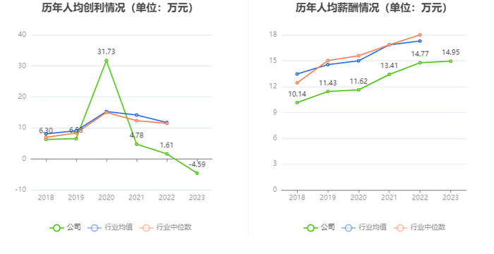 截至2023年末,公司员工总数为1419人,人均创收84.14万元,人均创利-4.59万元,人均薪酬14.95万元,较上年同期分别变化-2.04%、-386.01%、1.26%。