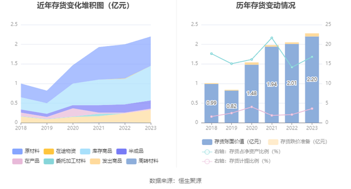 从存货变动来看,截至2023年年末,公司存货账面价值为2.2亿元,占净资产的16.81%,较上年末增加1980.17万元。其中,存货跌价准备为827.96万元,计提比例为3.62%。