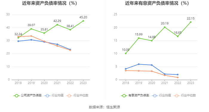 在偿债能力方面,公司2023年年末资产负债率为45.20%,相比上年末上升6.79个百分点;有息资产负债率为22.15%,相比上年末上升5.50个百分点。