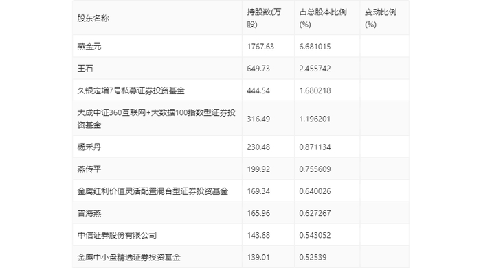 年报显示,2023年年末公司十大流通股东中,新进股东为金鹰红利价值灵活配置混合型证券投资基金,取代了三季度末的金鹰核心资源混合型证券投资基金。在具体持股比例上,大成中证360互联网+大数据100指数型证券投资基金持股有所上升,燕金元、王石、久银定增7号私募证券投资基金、杨禾丹、燕传平、曾海燕、中信证券股份有限公司、金鹰中小盘精选证券投资基金持股有所下降。