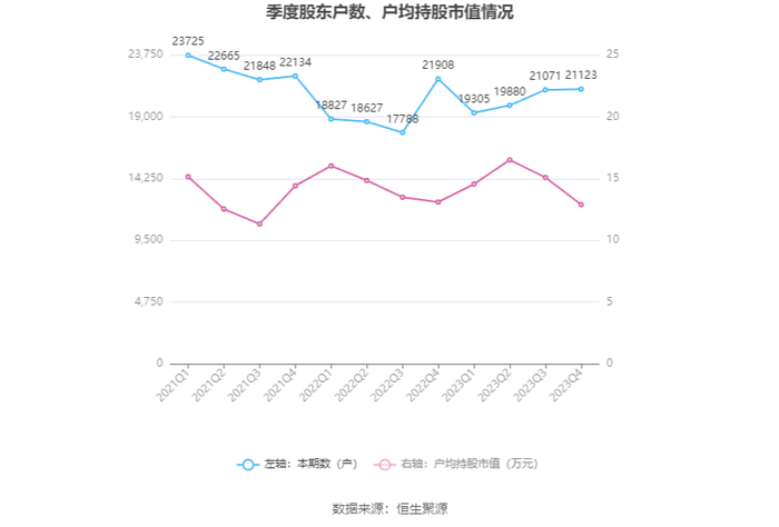 筹码集中度方面,截至2023年年末,公司股东总户数为2.11万户,较三季度末增长了52户,增幅0.25%;户均持股市值由三季度末的15.09万元下降至12.90万元,降幅为14.51%。