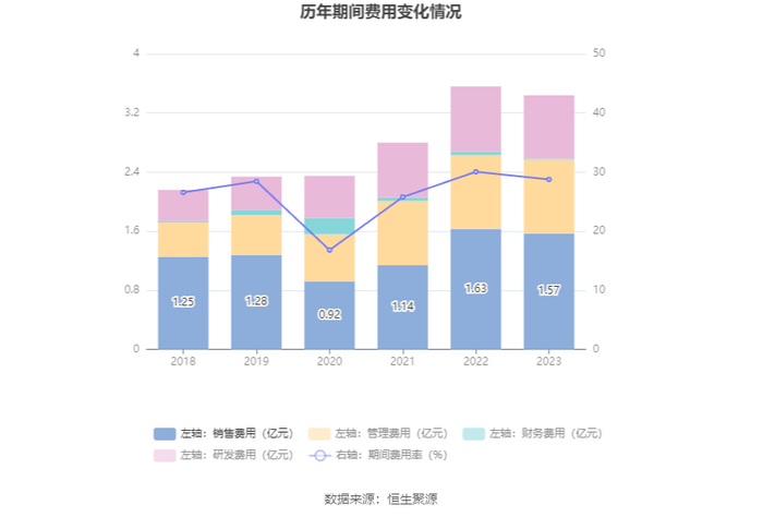 2023年,公司期间费用为3.44亿元,较上年同期减少1235.72万元;期间费用率为28.77%,较上年同期下降1.30个百分点。其中,销售费用同比下降4.21%,管理费用同比下降0.7%,研发费用同比下降1.94%,财务费用同比下降67.35%。