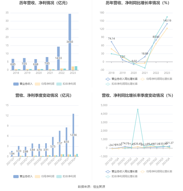 仕净科技(301030)4月25日披露2023年年报。2023年,公司实现营业总收入34.43亿元,同比增长140.19%;归母净利润2.17亿元,同比增长123.30%;扣非净利润2.37亿元,同比增长165.22%;经营活动产生的现金流量净额为-1.30亿元,上年同期为-7.41亿元;报告期内,仕净科技基本每股收益为1.55元,加权平均净资产收益率为13.78%。公司2023年年度利润分配预案为:拟向全体股东每10股转4股派3元(含税)。