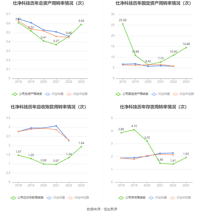 营运能力方面,2023年,公司公司总资产周转率为0.59次,上年同期为0.46次(2022年行业平均值为0.46次,公司位居同行业14/29);固定资产周转率为14.48次,上年同期为10.90次(2022年行业平均值为5.74次,公司位居同行业5/29);公司应收账款周转率、存货周转率分别为1.94次、1.92次。