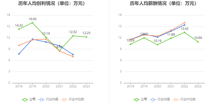 截至2023年末,公司员工总数为1769人,人均创收194.61万元,人均创利12.25万元,人均薪酬10.96万元,较上年同期分别变化5.23%、-2.17%、-18.42%。