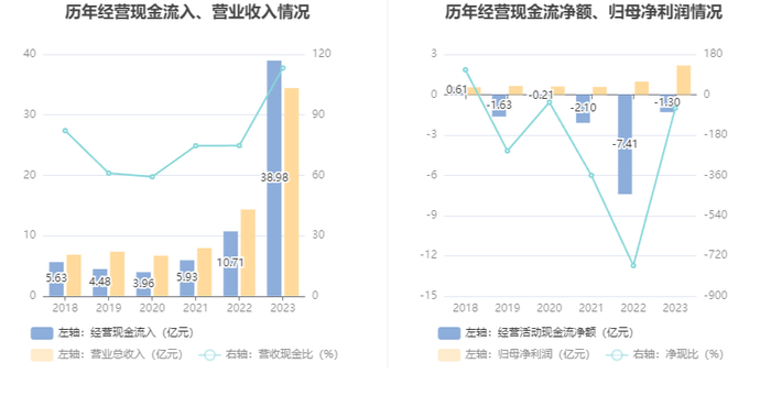 2023年,公司经营活动现金流净额为-1.30亿元,同比增加6.11亿元;筹资活动现金流净额8.29亿元,同比增加1.85亿元;投资活动现金流净额-5.63亿元,上年同期为-1.0亿元。