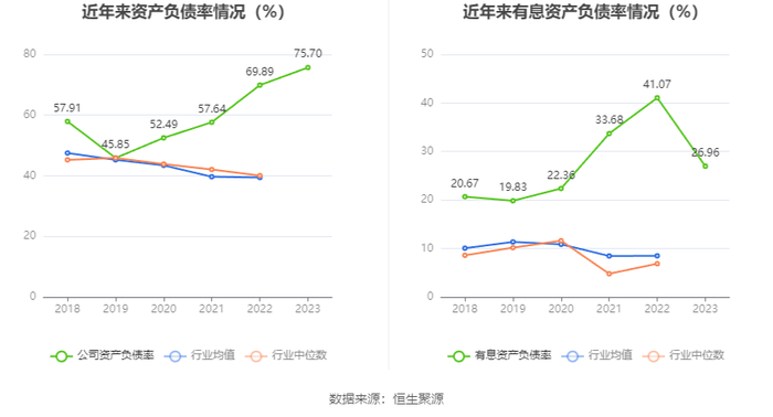 在偿债能力方面,公司2023年年末资产负债率为75.70%,相比上年末上升5.81个百分点;有息资产负债率为26.96%,相比上年末下降14.11个百分点。