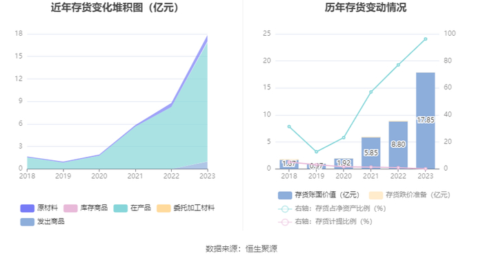 从存货变动来看,截至2023年年末,公司存货账面价值为17.85亿元,占净资产的96.29%,较上年末增加9.05亿元。其中,存货跌价准备为204.99万元,计提比例为0.11%。