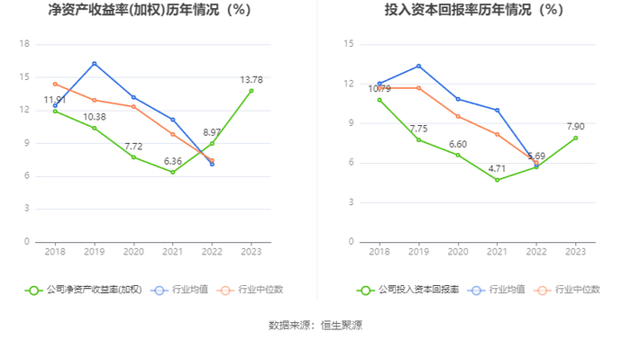 数据显示,2023年公司加权平均净资产收益率为13.78%,较上年同期增长4.81个百分点;公司2023年投入资本回报率为7.90%,较上年同期增长2.21个百分点。
