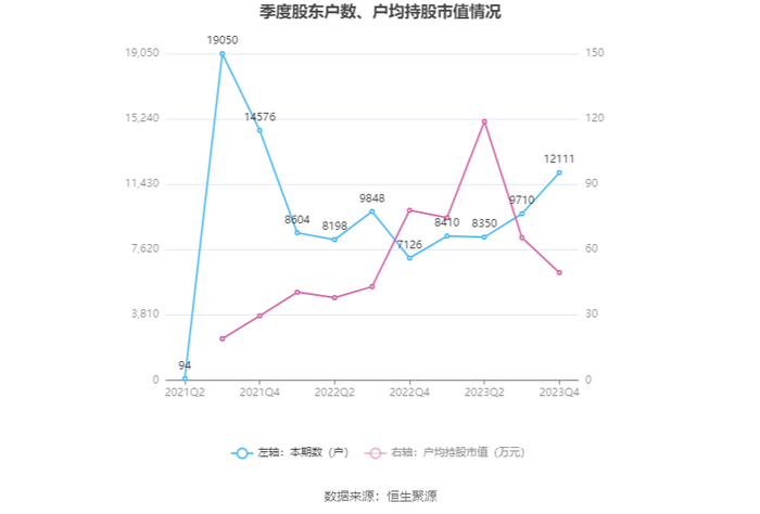 筹码集中度方面,截至2023年年末,公司股东总户数为1.21万户,较三季度末增长了2401户,增幅24.73%;户均持股市值由三季度末的65.54万元下降至49.46万元,降幅为24.53%。