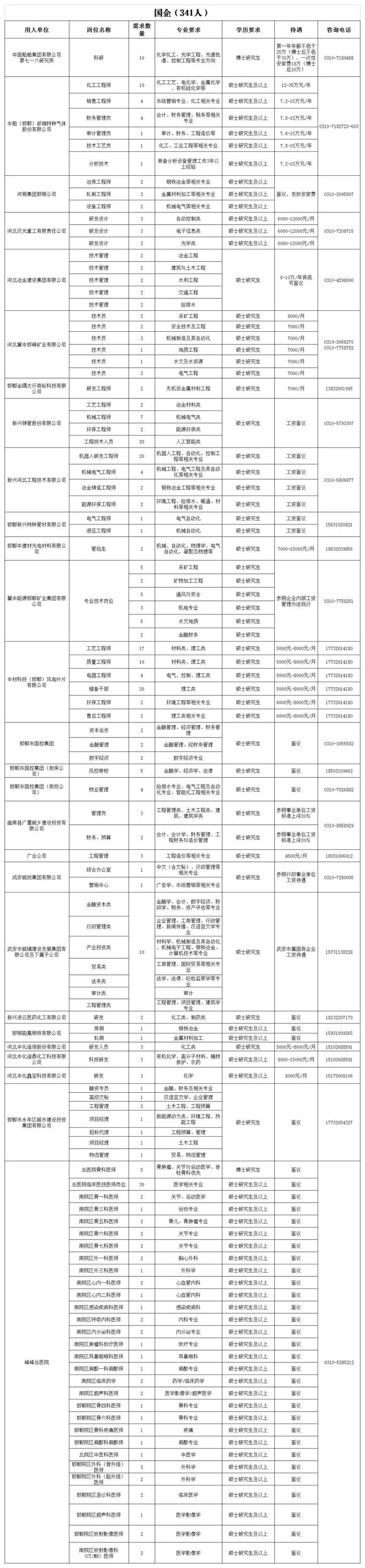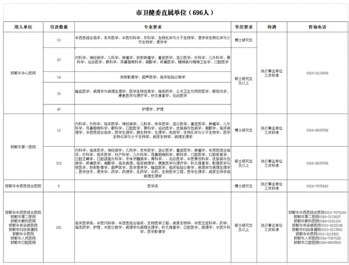 本次企事业单位共引进人才3323名,其中,市卫健委直属医院696名,市教育局直属学校300名,市属院校90名,县(市、区)事业单位841名,企业1396名。引进岗位、专业、人数见附件《邯郸市2024年博硕人才岗位需求表》,具体报名方式、程序、待遇及其他事项详见各引才单位公告。