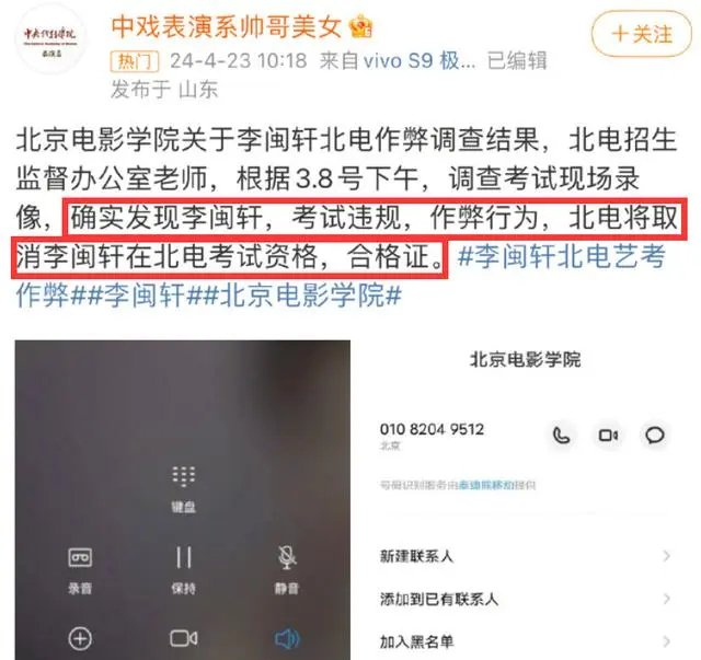 “艺考 作弊”、“李闽轩回应”、“北电取消其专业成绩”、“中戏回应李某某报考”等多个相关话题,这两天连续冲上热搜。有博主爆料,2024届表演艺考生李闽轩参加北电复试作弊,被取消考试资格、合格证。