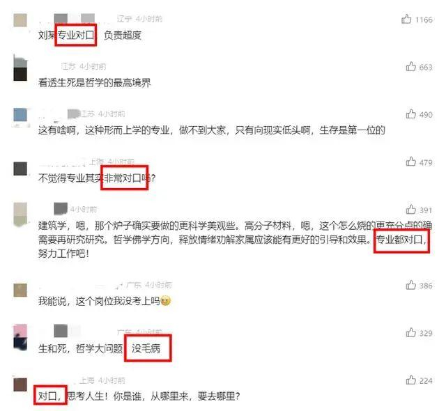 “看透生死是哲学的最高境界”“生和死,哲学大问题,没毛病”“哲学佛学方向,释放情绪劝解家属应该能有更好的引导和效果。专业都对口”……在有关该内容的评论区,网友对公布的拟录取人员专业分布,多次留言提到“专业对口”。