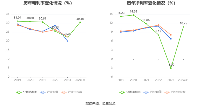 2024年第一季度,公司毛利率为30.46%,同比上升7.69个百分点;净利率为10.75%,较上年同期上升6.83个百分点。