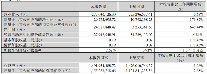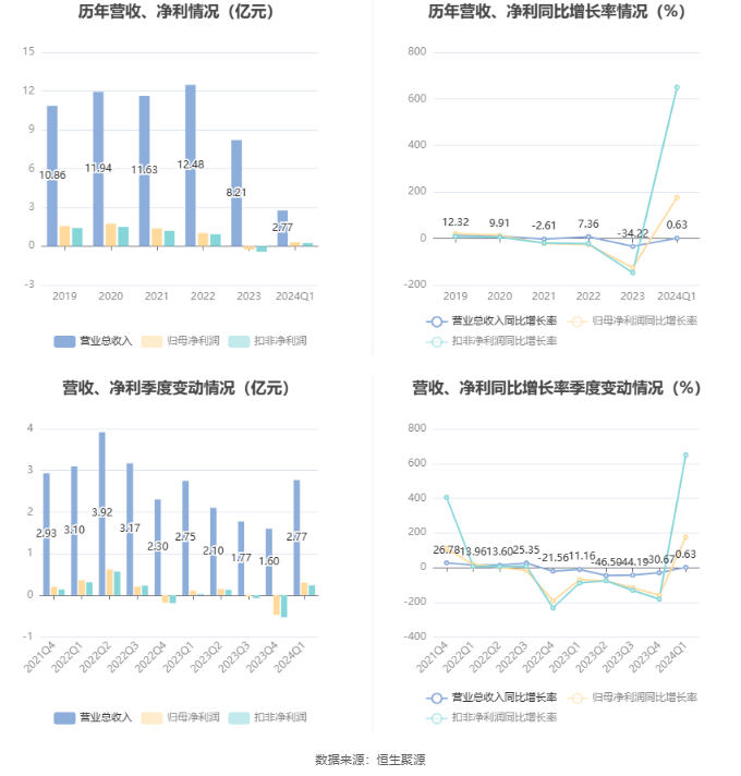 2024年第一季度,公司经营活动现金流净额为-2794.25万元,同比增加2634.66万元;筹资活动现金流净额-62.64万元,同比减少1497.38万元;投资活动现金流净额-1429.50万元,上年同期为1002.25万元。