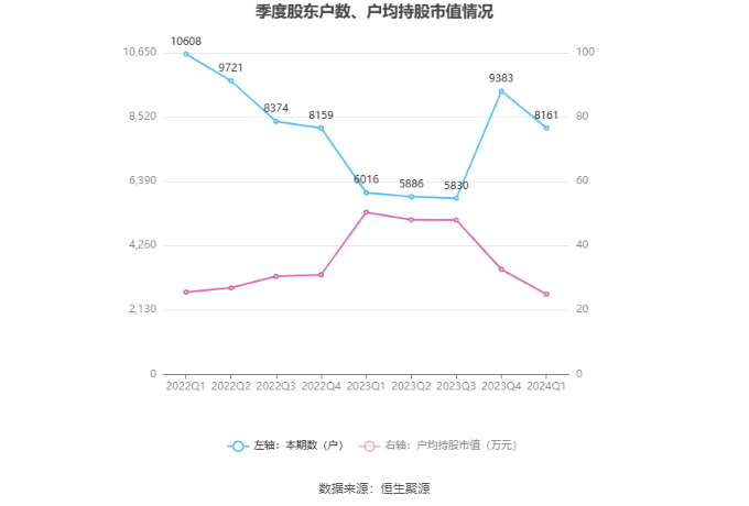 筹码集中度方面,截至2024年一季度末,公司股东总户数为8161户,较上年末下降了1222户,降幅13.02%;户均持股市值由上年末的32.67万元下降至24.89万元,降幅为23.81%。