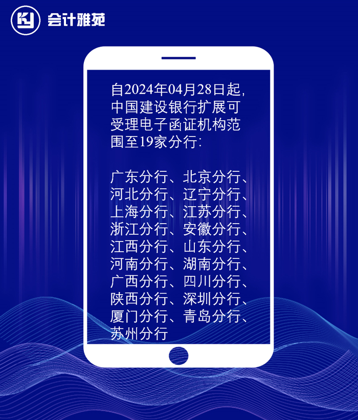 自2024年04月28日9点起,中国建设银行扩展可受理电子函证机构范围至19家分行:
