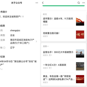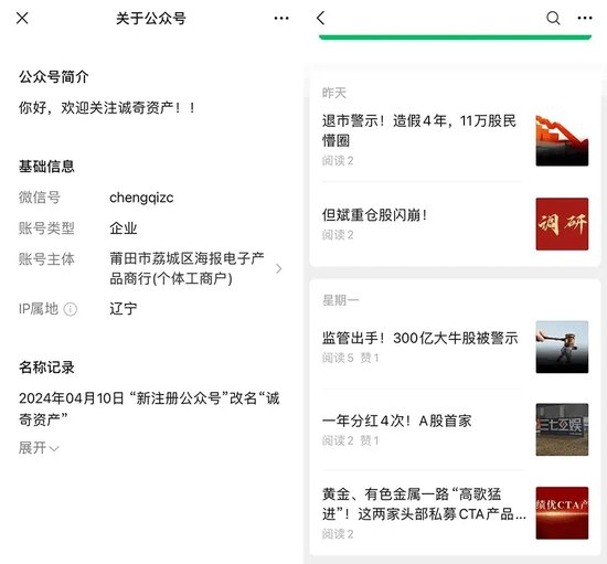 近日,记者查询公众号发现,名为“莆田市荔城区海报电子产品商行(个体工商户)”的主体将新注册的公众号名称改为“诚奇资产”,公众号简介为:“你好,欢迎关注诚奇资产!!”而从内容来看,该公众号发布了多篇与私募和股市相关的文章。