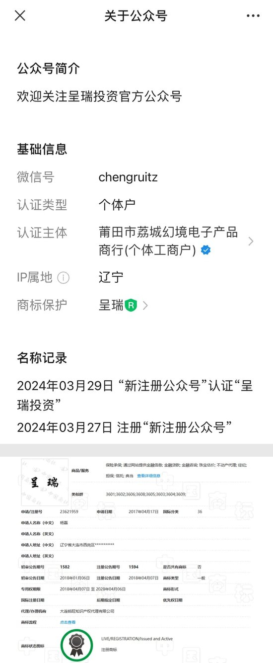 公开信息显示,莆田市荔城幻境电子产品商行经营者杨磊持有的呈瑞商标类型为第36类,第36类商标服务内容主要包括与银行和其他金融交易有关的服务,金融评估服务以及保险和不动产事务。