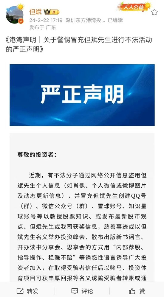 比如,今年2月,东方港湾创始人但斌在社交平台上发布《关于警惕冒充但斌先生进行不法活动的严正声明》。该声明称,有不法分子通过网络公开信息盗用但斌的个人信息,并冒充其创建QQ号(群)、微信公众号(群)、雪球账号、知识星球账号等,用“内部荐股、指导操作、稳赚不赔”等诱惑性语言诱导广大投资者加入。