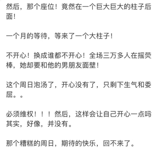 4月21日晚上7点20分左右,王女士来到自己的座位时却发现,座位前有一根巨大的水泥石柱,“什么都看不见,别说看舞台了,连内场都看不见。”
