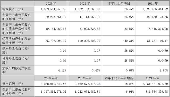 2023年,公司经营活动现金流净额为6579.71万元,同比下降40.31%;筹资活动现金流净额3.01亿元,同比增加3227.25万元;投资活动现金流净额-5196.12万元,上年同期为-1.04亿元。