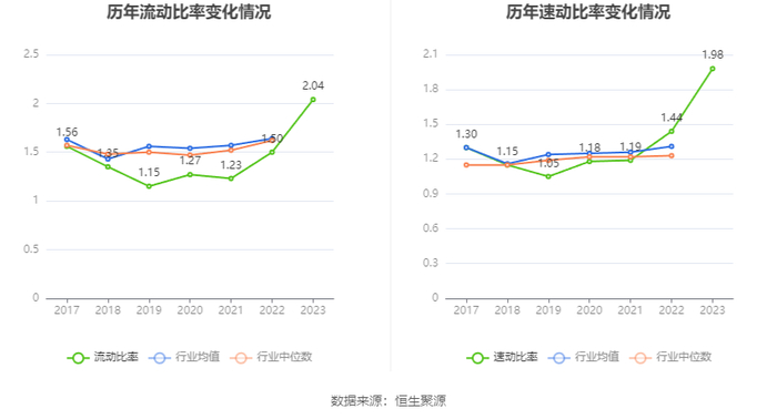 2023年,公司流动比率为2.04,速动比率为1.98。