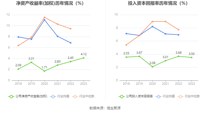 数据显示,2023年公司加权平均净资产收益率为4.12%,较上年同期增长0.67个百分点;公司2023年投入资本回报率为3.50%,较上年同期下降0.18个百分点。