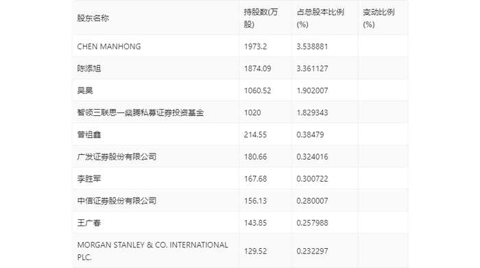 年报显示,2023年年末公司十大流通股东中,新进股东为广发证券股份有限公司、李胜军、中信证券股份有限公司、MORGAN STANLEY & CO. INTERNATIONAL PLC.,取代了三季度末的朱振华、邹晴、杨云苏、何丽华。在具体持股比例上,曾祖鑫持股有所上升,王广春持股有所下降。