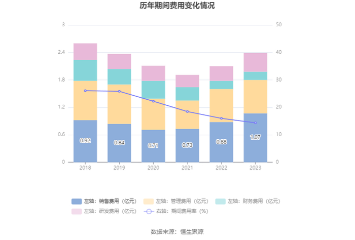 2023年,公司期间费用为2.39亿元,较上年同期增加2871.04万元;但期间费用率为14.37%,较上年同期下降1.62个百分点。其中,销售费用同比增长21.14%,管理费用同比增长1.66%,研发费用同比增长28.57%,财务费用同比下降0.78%。