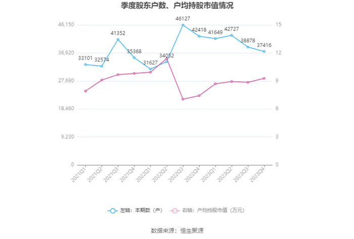 筹码集中度方面,截至2023年年末,公司股东总户数为3.74万户,较三季度末下降了1462户,降幅3.76%;户均持股市值由三季度末的8.86万元上升至9.28万元,增幅为4.74%。