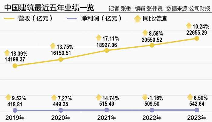 近期,中国建筑发布2023年年报,去年中国建筑营业总收入约2.27万亿元,同比增长10.2%,高于上年8.6%的增速;归属上市公司股东净利润542.6亿元,同比增长6.5%,改变了2022年增收不增利的局面。