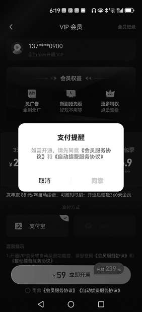 图二:不同意自动续费就无法开通会员。