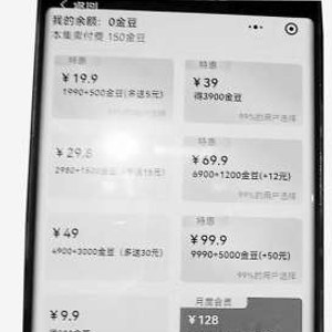 以记者体验的“青禾短剧”小程序为例,其中一部80集的《因果》,链接上标注了“热播”字样,点击开始观看,免费观看了9集后弹出付费链接,链接页面顶端标明“本集需付费150金豆”,下面列着不同缴费兑换标准:19.9元可购买“1990+500金豆(多送5元)”,39元“得390金豆”……月度会员128元“全场短剧免费观看30天”,年度会员365元“全网短剧——365天随便看”……这种充值方式,与网络小说的收费方式极为相似。