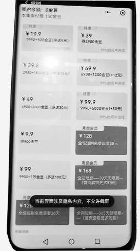 更值得注意的是,记者调查发现,不少微短剧应用中都没有充值说明、使用规则或用户须知。在“轻轻短剧”“青禾短剧”等应用中,记者看到收费方式大同小异,但是没有任何付费协议、说明。付款页面也无法截屏,消费者只要试图截屏就会弹出“当前页面涉及隐私内容,不允许截屏”的字样,这样一来,消费者很难留下充值证据。