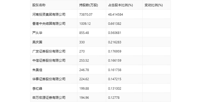 年报显示,2023年年末公司十大流通股东中,新进股东为广发证券股份有限公司、华泰证券股份有限公司、申万宏源证券有限公司,取代了三季度末的交银施罗德定期支付双息平衡混合型证券投资基金、鲍凌婕、中国工商银行股份有限公司企业年金计划-中国建设银行股份有限公司。在具体持股比例上,香港中央结算有限公司、严从华、中信证券股份有限公司、朱美佳、李红峰持股有所上升。