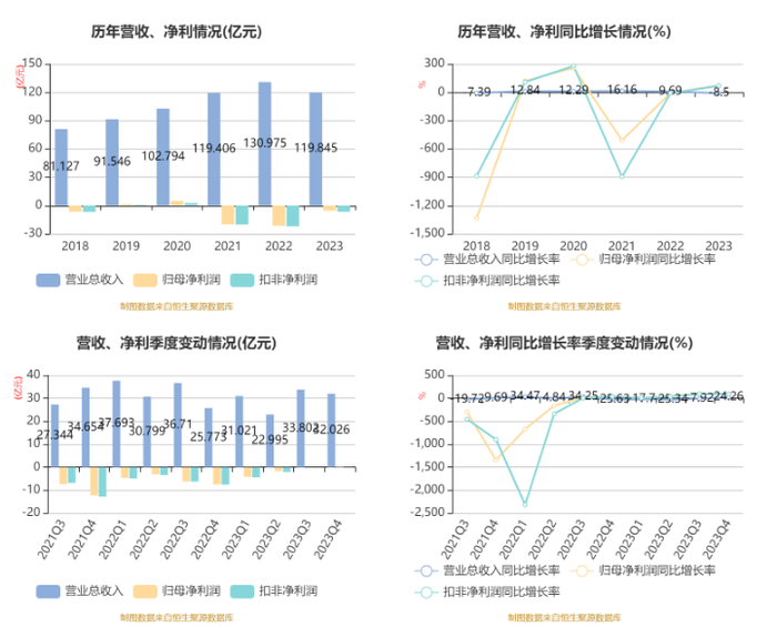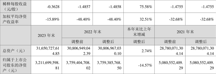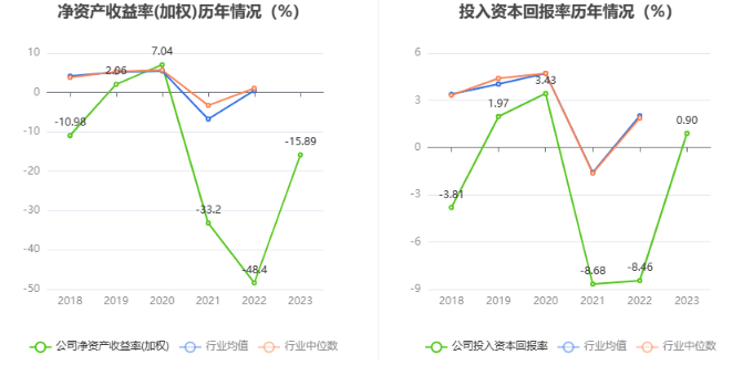数据显示,2023年公司加权平均净资产收益率为-15.89%,较上年同期增长32.51个百分点;公司2023年投入资本回报率为0.90%,较上年同期增长9.36个百分点。
