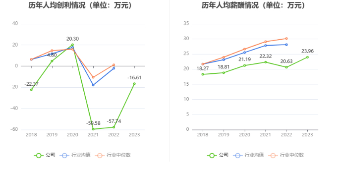 截至2023年末,公司员工总数为3332人,人均创收359.68万元,人均创利-16.61万元,人均薪酬23.96万元,较上年同期分别增长1.80%、71.23%、16.13%。