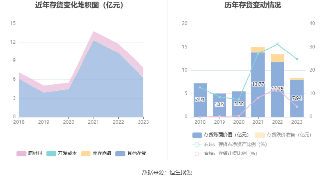 从存货变动来看,截至2023年年末,公司存货账面价值为7.94亿元,占净资产的24.72%,较上年末减少3.81亿元。其中,存货跌价准备为3604.82万元,计提比例为4.34%。
