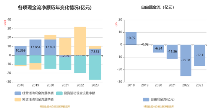 进一步统计发现,2023年公司自由现金流为-17.10亿元,上年同期为-25.31亿元。