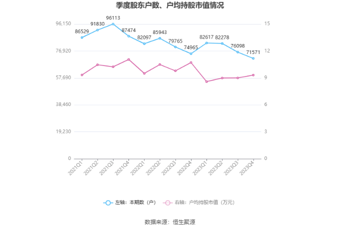 筹码集中度方面,截至2023年年末,公司股东总户数为7.16万户,较三季度末下降了4527户,降幅5.95%;户均持股市值由三季度末的9.00万元上升至9.32万元,增幅为3.56%。