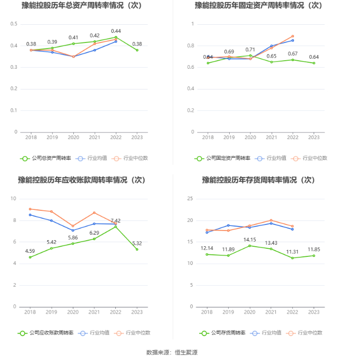 营运能力方面,2023年,公司公司总资产周转率为0.38次,上年同期为0.44次(2022年行业平均值为0.42次,公司位居同行业14/28);固定资产周转率为0.64次,上年同期为0.67次(2022年行业平均值为0.85次,公司位居同行业21/28);公司应收账款周转率、存货周转率分别为5.32次、11.85次。