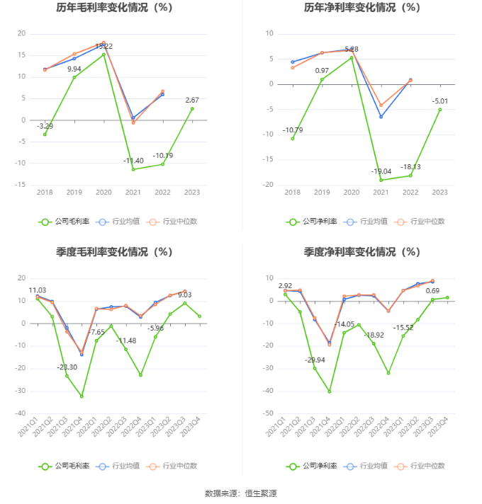 2023年,公司毛利率为2.67%,同比上升12.86个百分点;净利率为-5.01%,较上年同期上升13.12个百分点。从单季度指标来看,2023年第四季度公司毛利率为3.22%,同比上升26.12个百分点,环比下降5.81个百分点;净利率为1.50%,较上年同期上升33.51个百分点,较上一季度上升0.81个百分点。